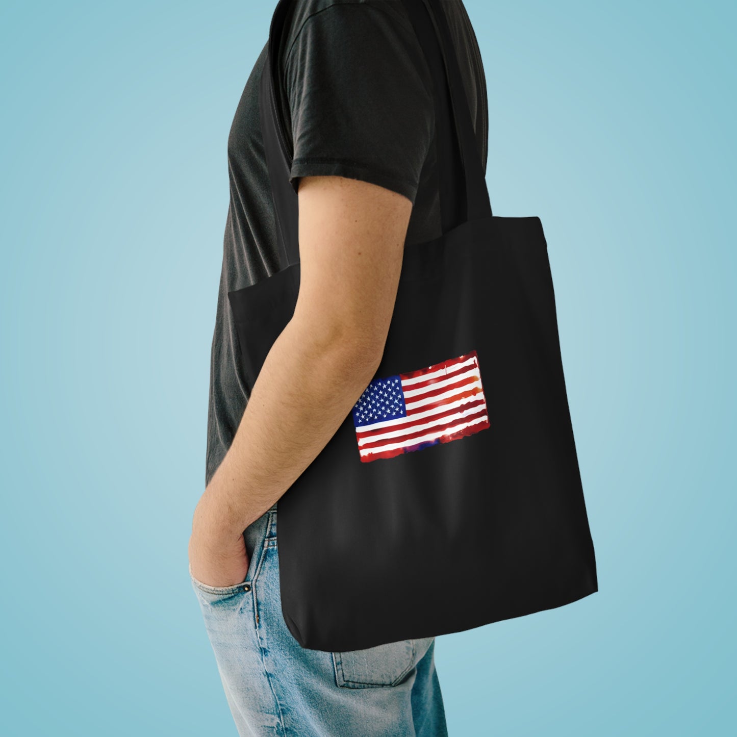 The cotton canvas tote bag is the ideal grab & go accessory. Made of 100% cotton, it features long, reinforced shoulder straps for exceptional comfort. This American Flag Watercolor tote (42cm x 42cm) fits right in with any style.