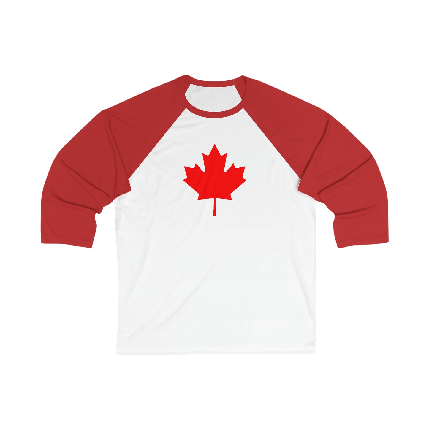 The unisex 3/4 sleeve baseball tee features the solid red Canadian maple leaf. The collar is ribbed knitting for improved durability. The sides have seams to provide structural support.