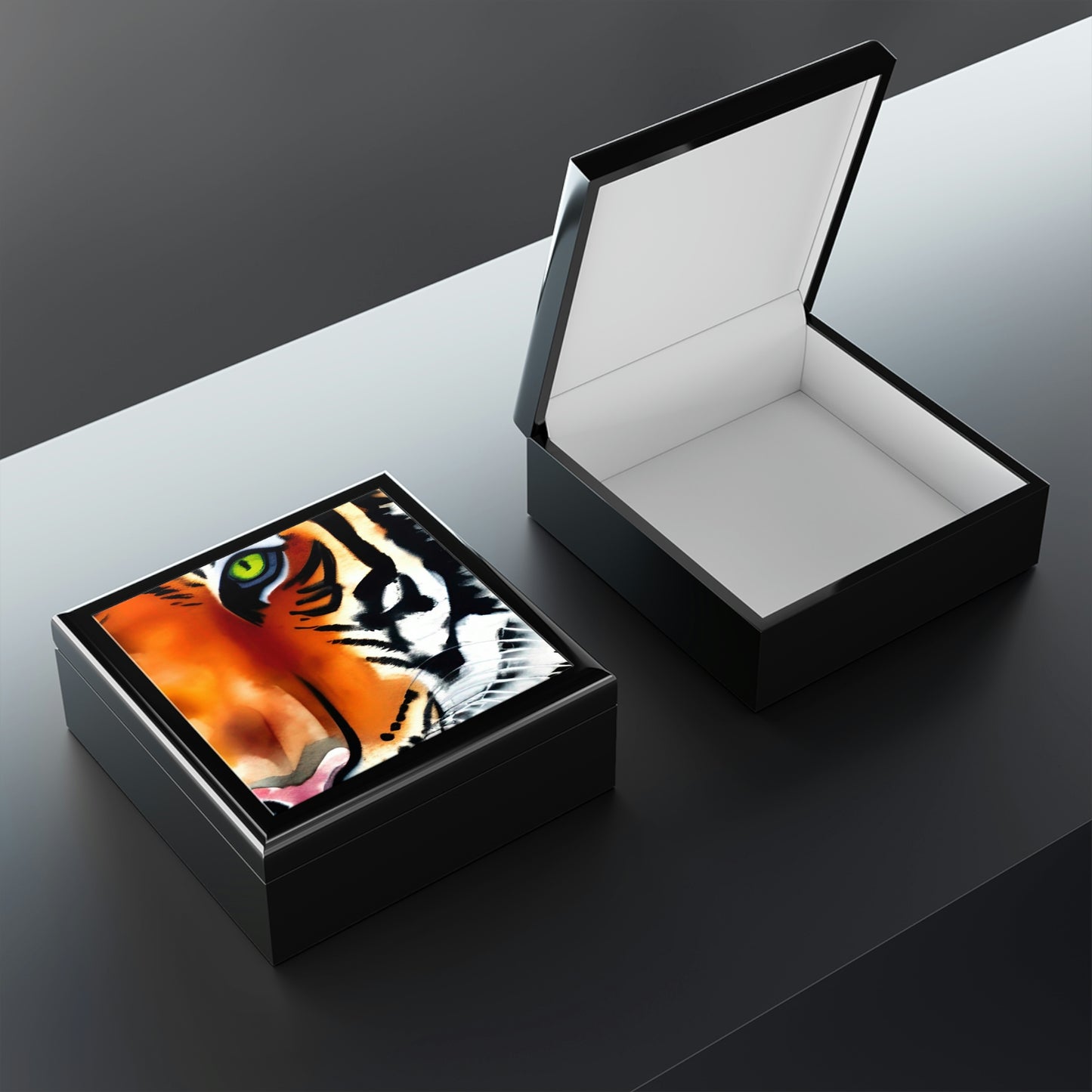 Keep all your valuables safe in custom style with this TIGER jewelry box. This jewelry box features dual hinges which lock at 90 degrees, an elegant glossy finish, and a soft interior lined with felt material.